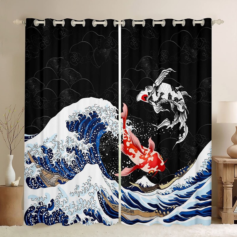 Japanese Ukiyoe Fish Curtains Ocean Surfing Koi Window Curtains for Bedroom Living Room Kids Boys Adult Japanese-Style Exotic Koi Animal Window Drapes Exotic Style Window Treatments 52x63L,2 Panels