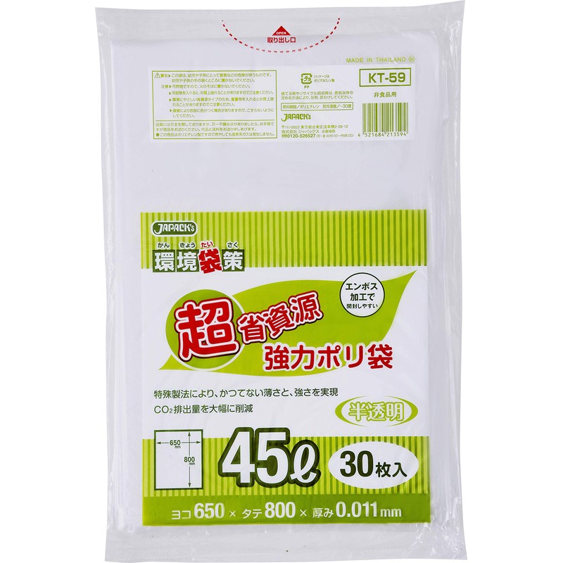 Japax KT-59 Trash Bags, Translucent, 10.9 gal (45 L), Height 31.5 x Width 25.6 x Thickness 0.004 inches (80 x 65 x 0.011 mm), Polybags, Environmental Bag, Super Resource Saving, Thin, Durable, Pack of 30