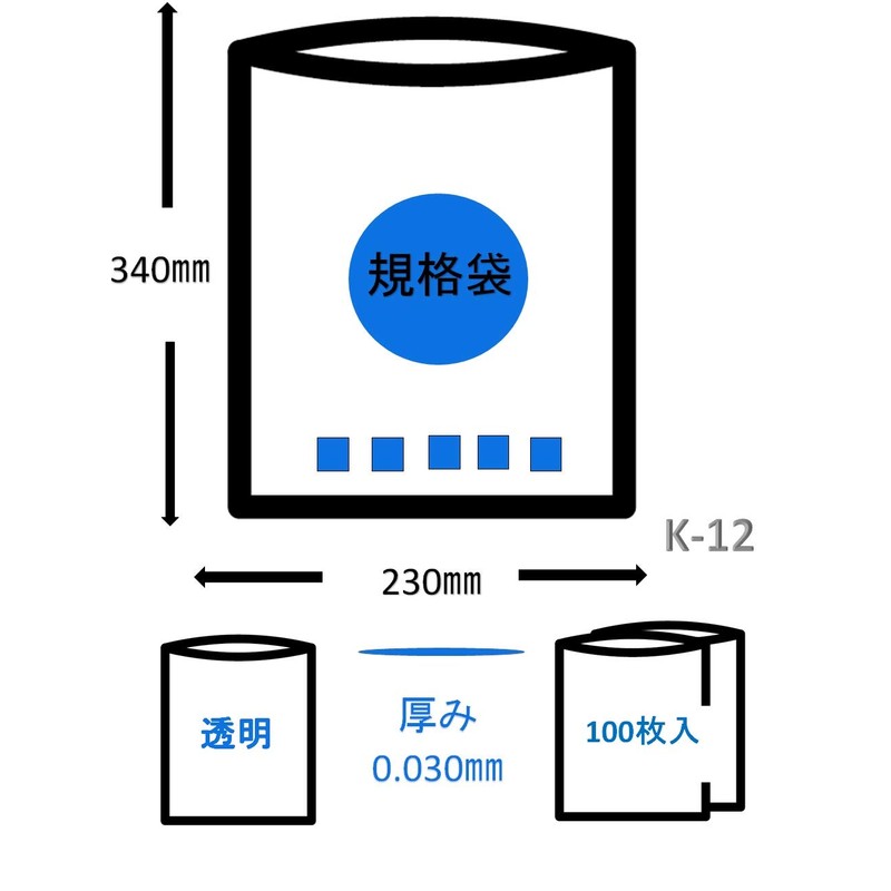 Japax Plastic Bags, Transparent, Width 9.1 x Height 13.4 inches (230 x 340 mm), Thickness 0.001 inches (0.03 mm), LD Standard Bag Series No. 12 K-12, Pack of 100