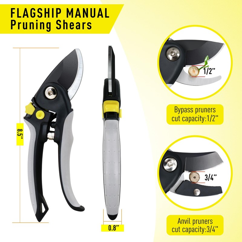 - PROFESSIONAL GARDEN SHEARS SET: including 8.5" bypass pruning shears for living branches, 8.5" anvil pruners for dried branches and 9" pointed garden clippers for flower twigs.