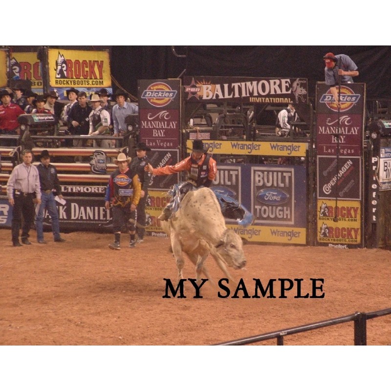 Available for purchase is a 8" by 10" Photo of Jared Farley. All of these PBR Bull Riding photos were taken with my digital camera at the highest setting and are printed on glossy photo paper. You will receive the photo without "my sample" on it.
