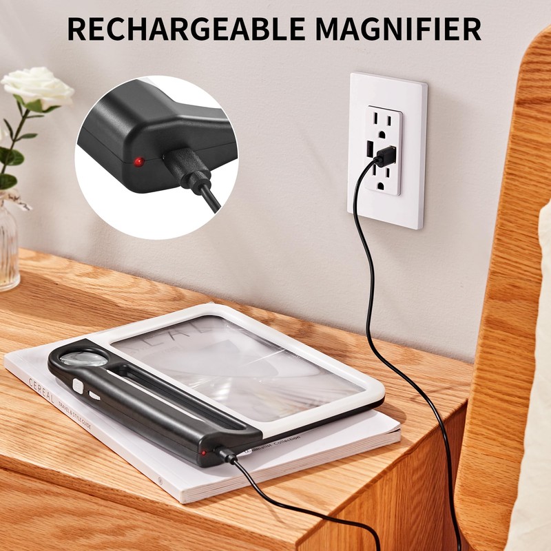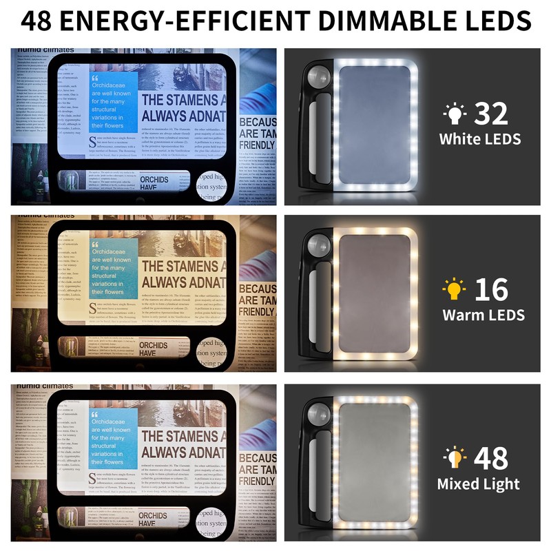- Type-C Rechargeable & Durable Magnifier: This magnifier features a USB Type-C charging port and is equipped with 48 bright LED lights, offering low, medium, and high brightness settings for an exceptional reading experience. The battery-free design is both cost-effective and provides long-lasting, energy-efficient lighting.