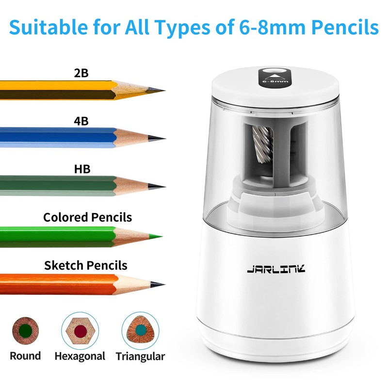 JARLINK Electric Pencil Sharpener, Heavy-Duty Helical Blade to Fast Sharpen, Auto Stop for No.2/Colored Pencils(6-8mm), AC Adapter/Battery Operated in School Classroom/Office/Home (White)