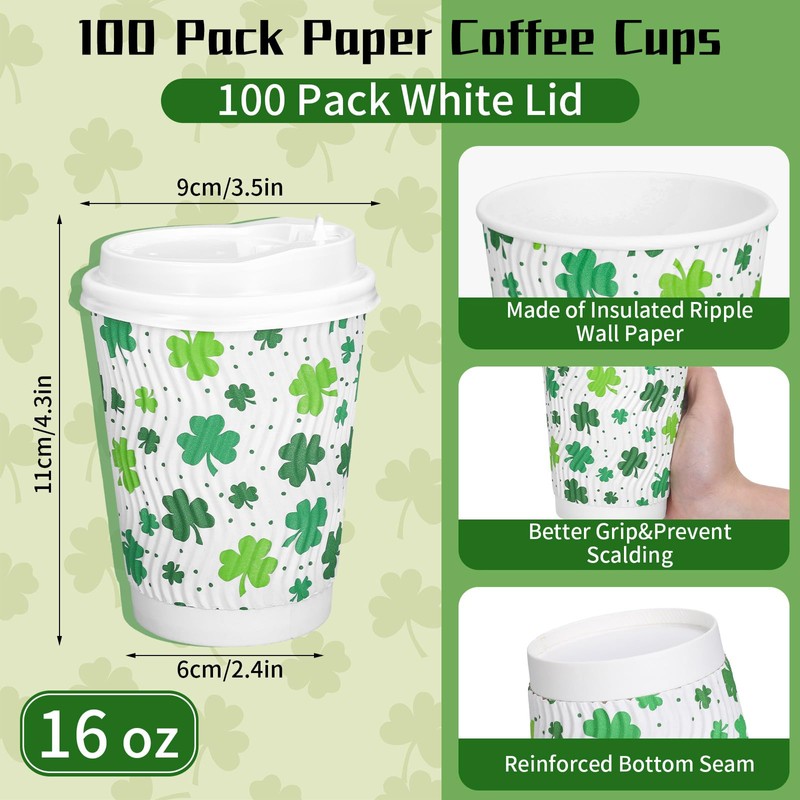 JarThenaAMCS 100 Sets 12oz St. Patrick’s Day Coffee Cups with Lids Green Shamrock Insulated Corrugated Ripple Wall Paper Cups for Home Office Irish Holiday Supplies