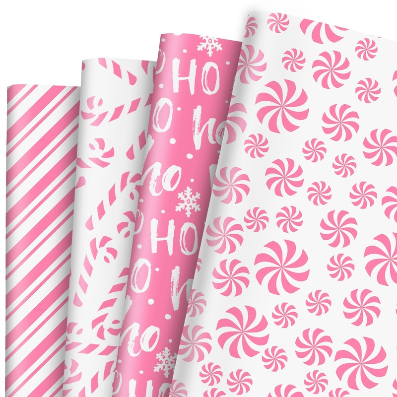 - PINK DESIGN: Colored in pink and white, Our Christmas and winter theme wrapping paper is patterned with Christmas elements, including candy, candy cane, stripe and more, totally 4 styles in available, will nicely increase festive atmosphere