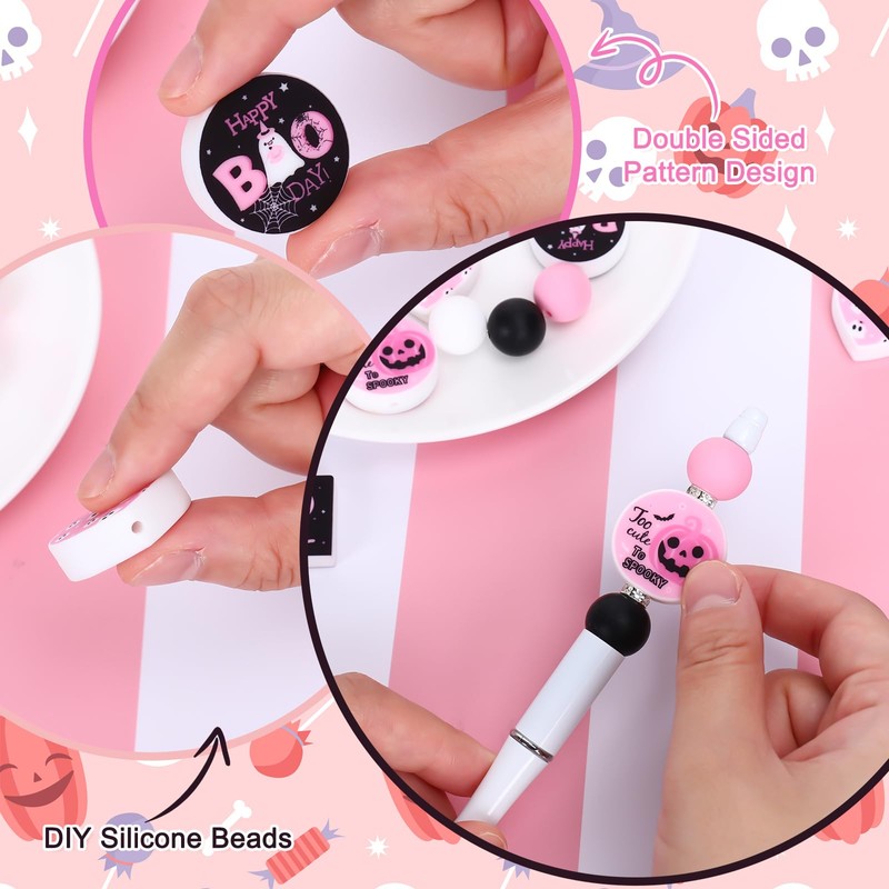 • HALLOWEEN THEME: Our halloween theme silicone focal beads are patterned with pumpkins, ghosts, bats, spiderweb and printed with various festive words, mainly colored in pink and black, shaped in round, rectangle and heart, cute and delicate.
