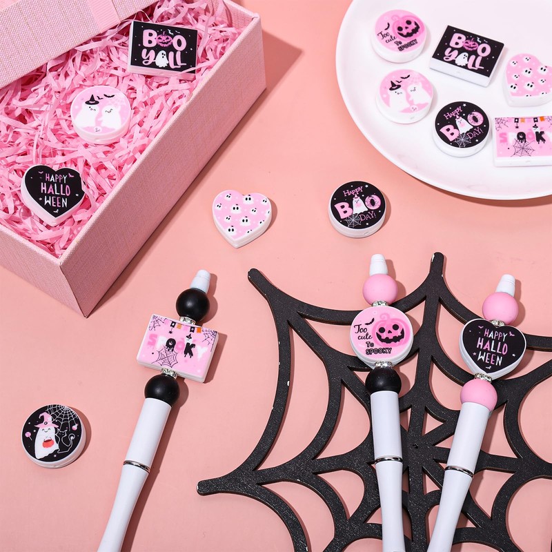 JarThenaAMCS 16Pcs Halloween Silicone Focal Beads Pink Black Cute Ghost Pumpkin Round Rectangle Heart Shape Loose Rubber Beads for DIY Crafts Keychain Pen Making