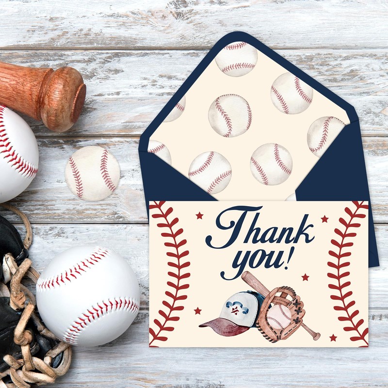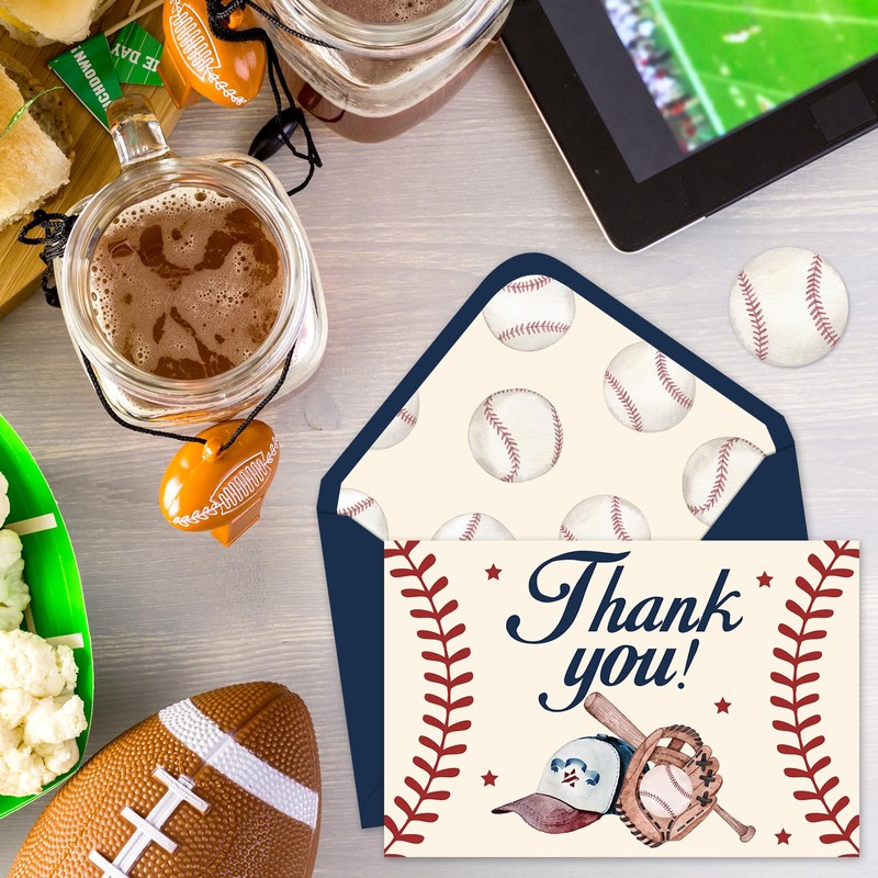 - BASEBALL DESIGN: Our greeting cards match sport theme, printed with baseball, baseball hat, bat patterns, and have letter Thank you, full of fun and perfect to express sincere gratitude