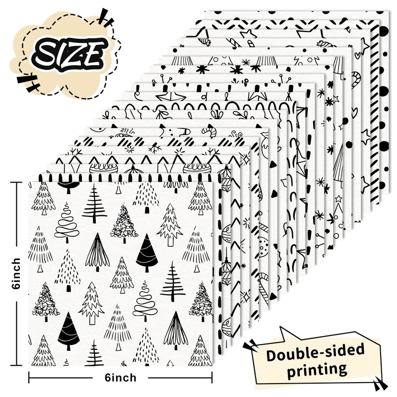 JarThenaAMCS 40 Sheets Christmas Pattern Paper Black White Hand Drawn Scrapbook Specialty Paper Double Sided Xmas Tree Snowflake Art Paper for DIY Crafts Supplies, 6 x 6 Inch