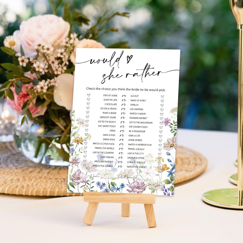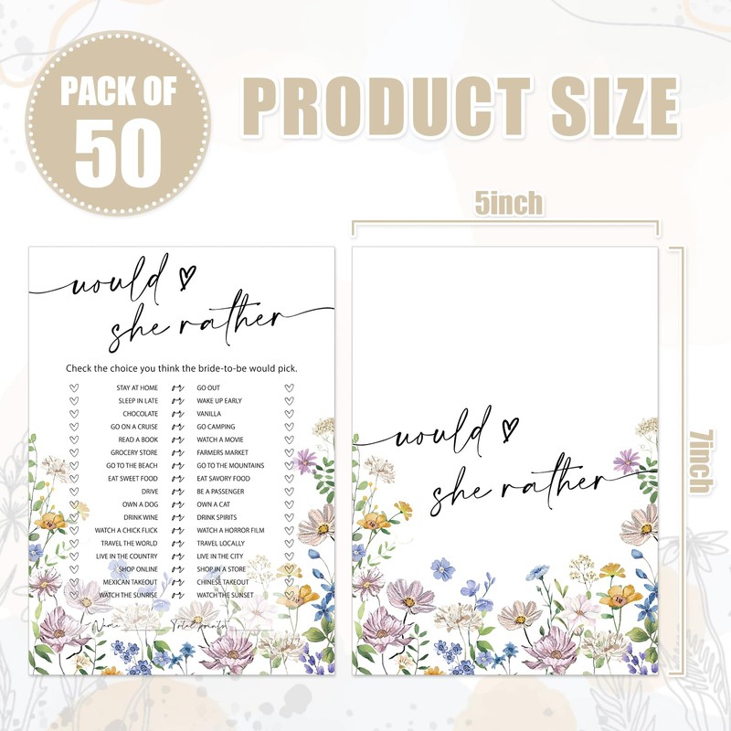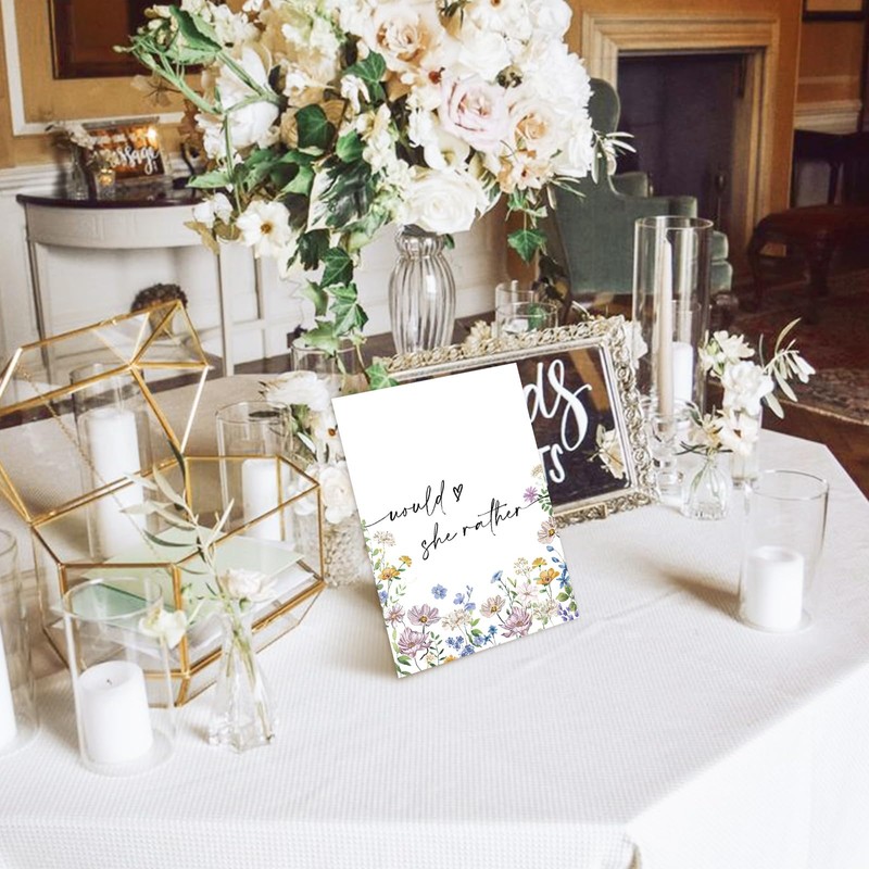 JarThenaAMCS 50 Sheets Wildflower Bridal Shower Game Cards Floral Double Sided Party Game Activity Cards for Would She Rather Wedding Bachelorette Party Games Supplies