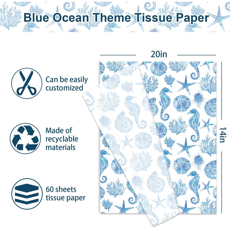 - IDEAL DECOR: Patterned with blue seahorse, shell, coral and starfish against the white background, exquisite and eye-catching, will nicely enrich the appearance of tissue paper and increase the fun atmosphere