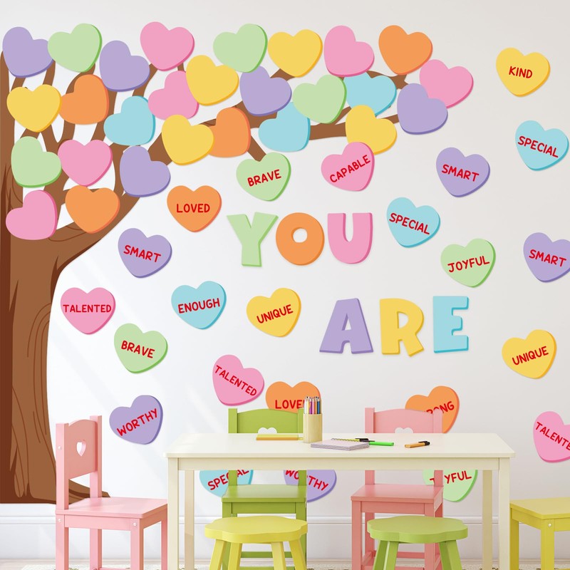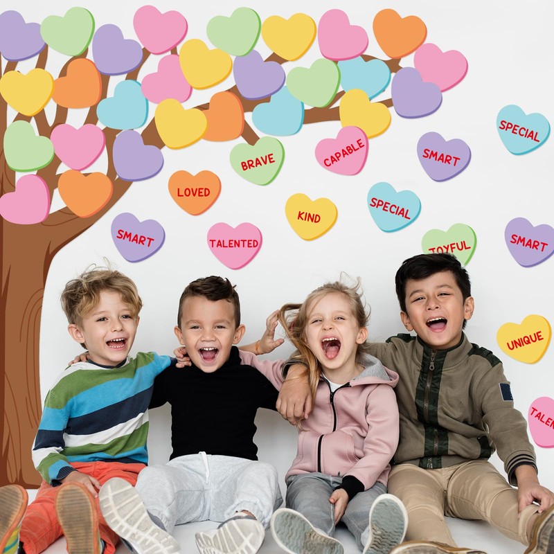 - CONVERSATION HEART TREE THEME: Our decoration kit takes conversation heart tree as the theme, patterned with a variety of candy heart cutouts with positive sayings, pastel color and sweet design can add a different color to your room decor, creating a warm and romantic learning environment for your kids or students.
