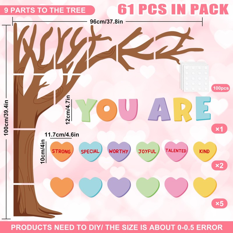 - GREAT BULLETIN BOARD DECOR: The package comes with 1 set of big tree cutouts, consist of 9 parts of tree trunks, 6pcs English(YOU ARE), 24pcs conversation heart cut-outs, 30pcs blank heart cutouts with 6 colors, plus 100pcs glue points, large quantity and rich styles for your classroom decorations.
