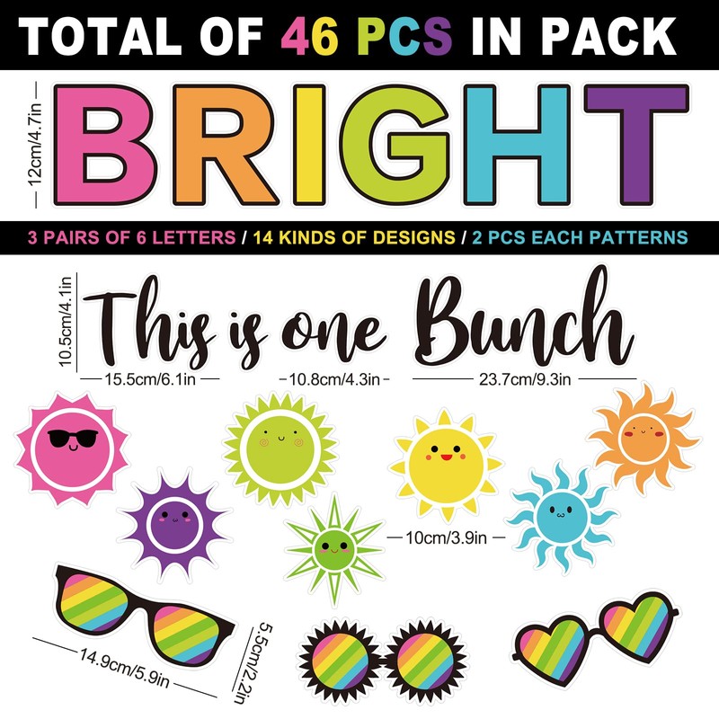 - SUN & SUNGLASSES DESIGN: Our bulletin board decorations featuring summer theme, designed with colorful suns, sunglasses and the words of this is one bright bunch, vivid and funny, full of tropical atmosphere.