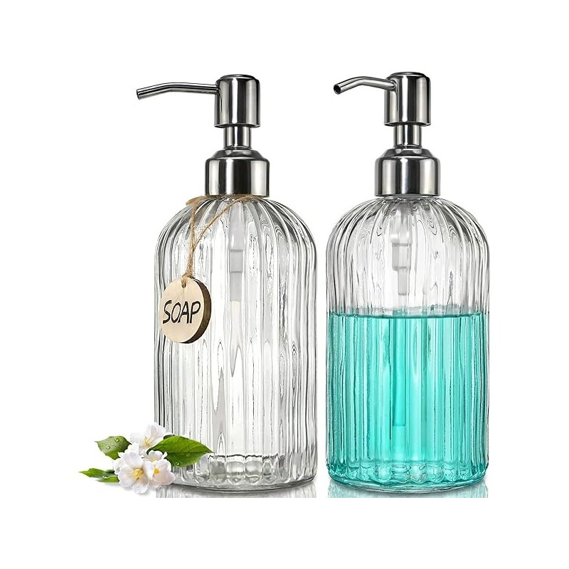 JASAI 2PACK 18 Oz Glass Soap Dispenser with Rust Proof Stainless Steel Pump, Refillable Hand Soap Dispenser with Vertical Stripe, Premium Bathroom soap Dispenser for Kitchen & Bathroom