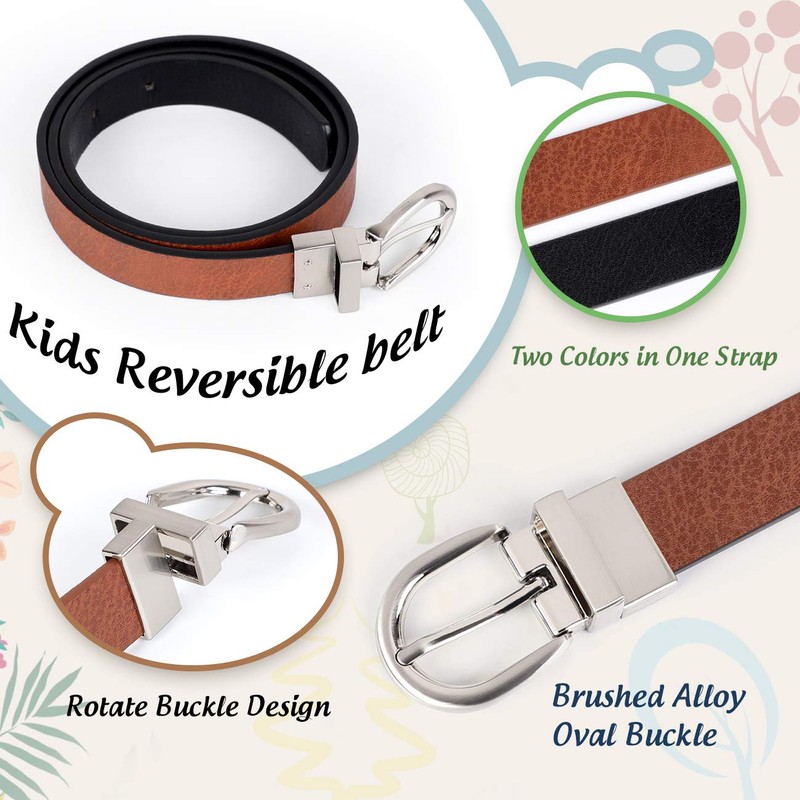 - 🌺 Comfort Reversible Leather Strap: Our kids belt is made of long-lasting faux leather. The width is 0.9 inch. It is very sturdy and comfortable for kids use. Two colors side and texture perfectly combination in one belt. Their adjustable ensures kids hold up pants well. A versatile belt for boys&girls who need to look great throughout the whole day.