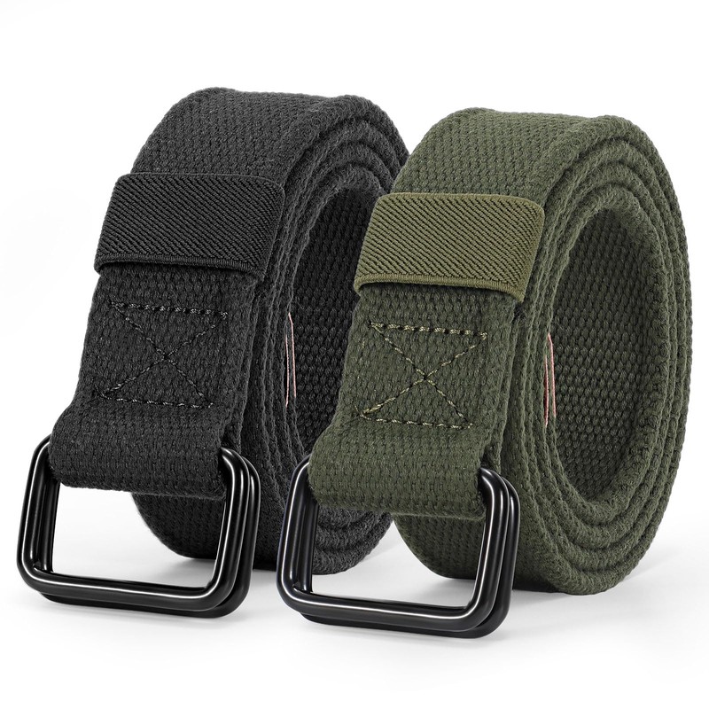 JASGOOD Men Canvas Fabric Belts Casual Web Cloth Belts with Black Double Ring Buckle 2 Pack,Black+Army Green
