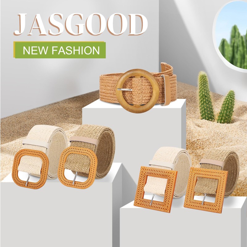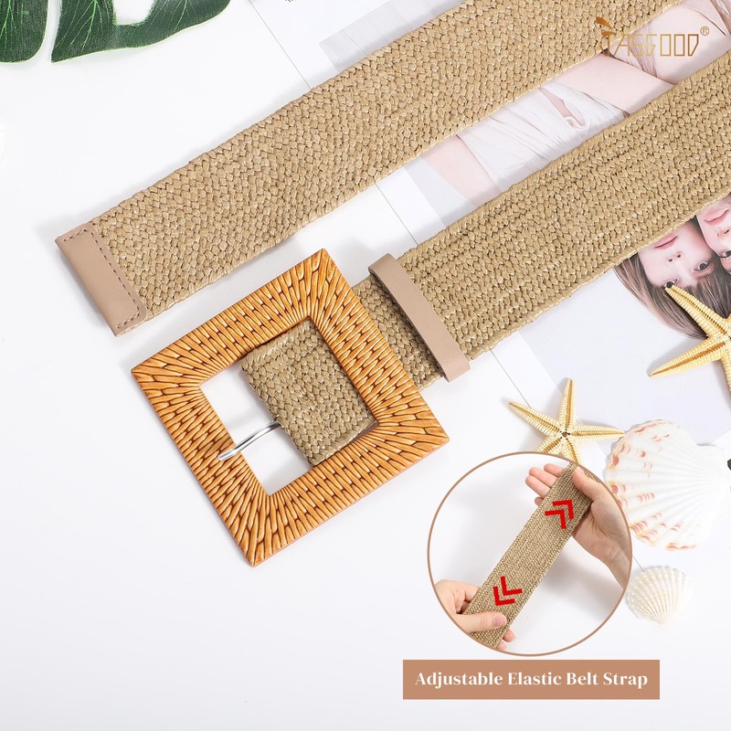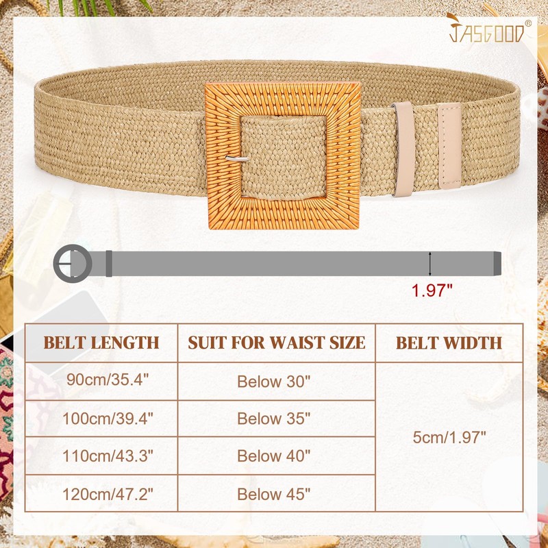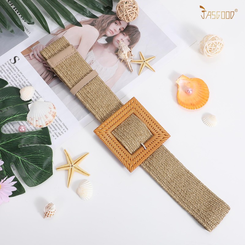 JASGOOD Straw Woven Elastic Stretch Belts for Women, Ladies Wide Boho Braided Dress Belts with Square Buckle,Khaki