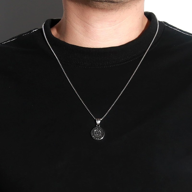 Embrace the ancient symbolism and craftsmanship of this striking pendant necklace. Crafted from durable stainless steel, the pendant features an intricate design inspired by Norse mythology. At the centre lies the iconic Valknut symbol, a powerful triskelion representing the cyclical nature of life, death, and rebirth. Surrounding this emblem are runic inscriptions etched in a circular pattern, adding an aura of mystery and tradition. The pendant hangs elegantly from a sturdy box chain, allowing you to showcase your appreciation for Norse culture. With its bold aesthetic and symbolic significance, this necklace is a captivating accessory for those drawn to the rich heritage of the Vikings. Measuring approximately 2.5 cm in diameter, it strikes the perfect balance between statement-making and versatility. Elevate your look with a touch of ancient Norse allure.