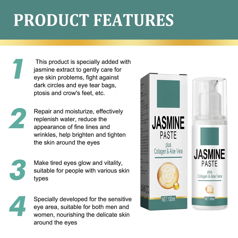 - Rich and healthy ingredients: jasmine ointment dark circles is rich in collagen and aloe vera. Rich in various plant extracts, it provides the skin with the moisture and nutrients it needs. These additives moisturise the skin during daily care.