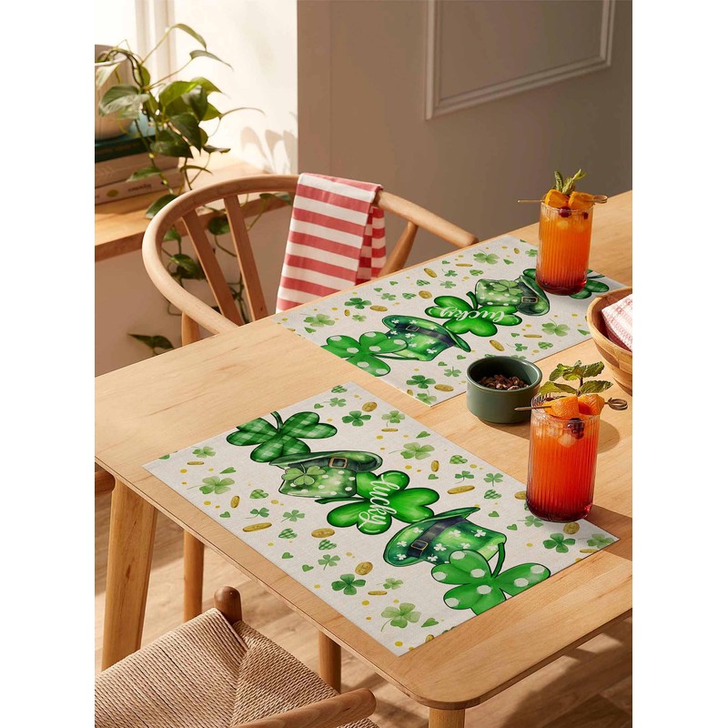- St.Patrick's Decorations of Outdoor Indoor TableThe clover table placemats perfect for daily use, match with dark wood table, glass table,white dining table. Great for indoor outdoor, under coffee maker, on dining table, coffee table, buffets table, drawer cabinet, spring summer holidays parties. Also you can match it with our St.Patrick's table runner/tablecloth to decorate your dining table together.Elevate your St.Patrick's themed dining experience with our St Patrick's placemats!