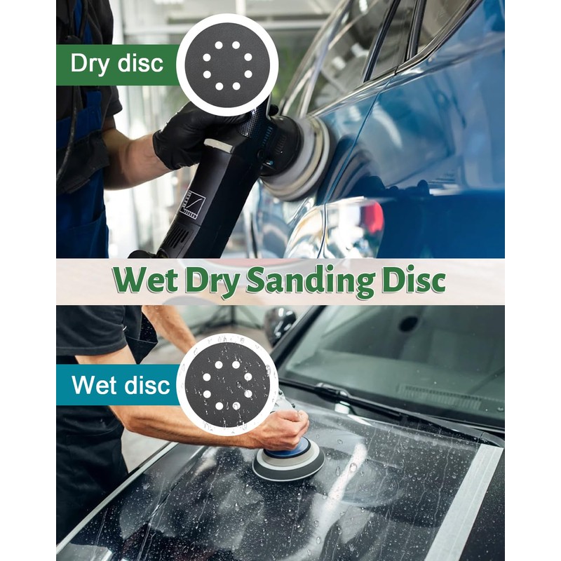 - Wet and dry sandpaper: 8-hole sanding disc can be used wet and dry. Wetting is more effective as the particles in the grinding surface are washed away to avoid blockages.