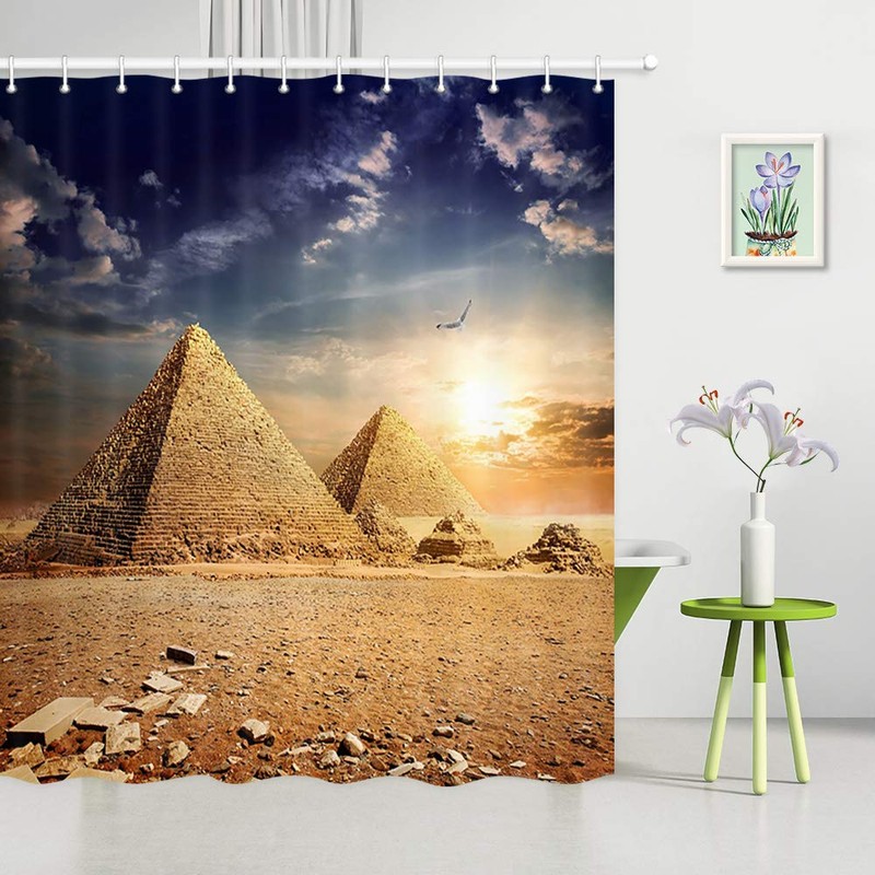 JAWO Egypt Travel Shower Curtain Fabric for Bathroom, Old Egyptian Pyramids History in Desert with Flying Eagle Bird Nature Sunshine, Egyptian Landscape Bath Curtains with Hooks, 69X70 Inches