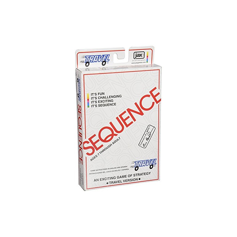 It's all the fun and excitement of SEQUENCE in a travel version you can play anywhere you go! Play a card from your hand and place a peg in a corresponding hole on the game board when you have four in a row, it’s a SEQUENCE. Learn to block your opponents or remove their pegs, and watch out for the Jacks - they're wild! With a little strategy and a little luck, you’re a winner! This compact version of SEQUENCE easily stores the game pieces, and pegs replace the tokens, making it easy to enjoy this classic game while you travel. For 2 players, ages 7 and up.