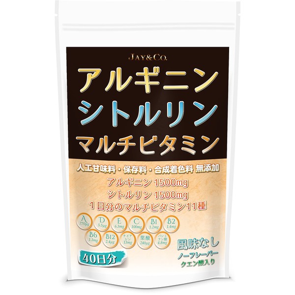 JAY&CO. アルギニン & シトルリン パウダー (1回当たり1500mg&1500mg配合) 人工甘味料・保存料無添加・国内製造 (無香料マルチビタミン入), 40回分)