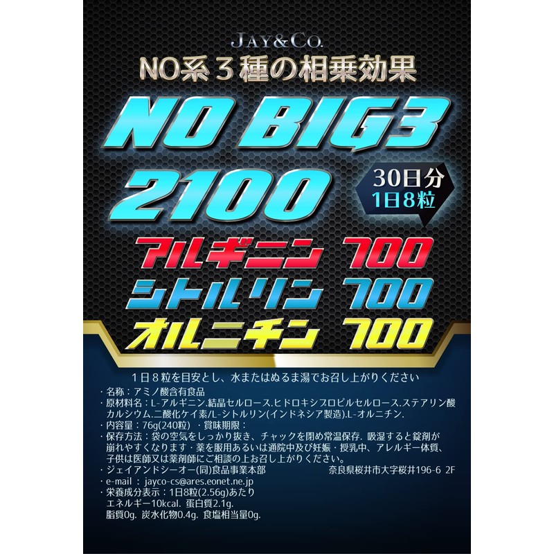 JAY&CO. NO BIG3 アルギニン ・ シトルリン ・ オルニチン (700mg×3種) 錠剤 (30日分,240粒)