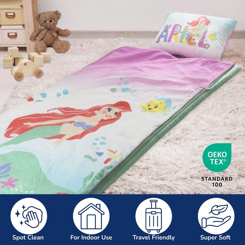 Make nap time magical with our indoor The Little Mermaid 2-piece slumber set, complete with a pillow for the perfect sleepover experience. This cozy set includes a soft and comfortable 54” x 27” nap mat and a 17” x 11” plush pillow, both adorned with the beloved Ariel from Disney’s The Little Mermaid. Crafted from high-quality materials, the sleep set offers both comfort and durability for restful naps or sleepovers. The vibrant The Little Mermaid design adds a fun, playful touch to any room decor, making it perfect for fans of all ages. The Little Mermaid sleeping mat features a convenient zipper closure and rolls up for easy storage and portability, while the pillow provides extra comfort. Keep it fresh with simple spot cleaning, this sleeping bag is the ultimate Disney gift for all The Little Mermaid lovers!