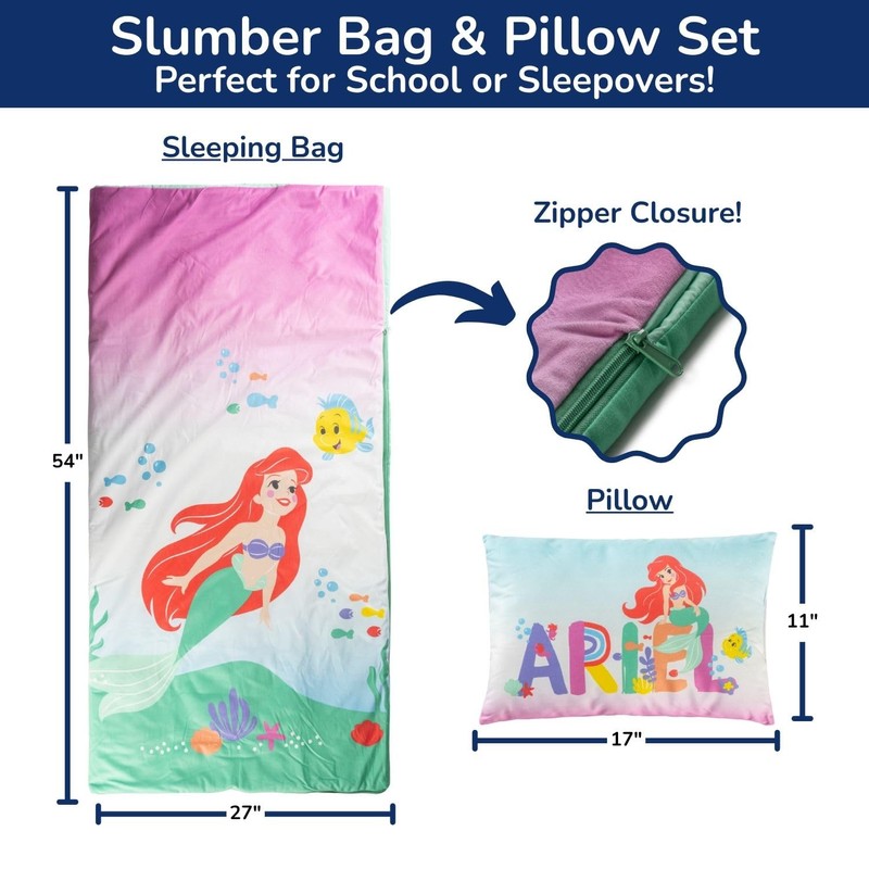 Jay Franco Kids Slumber Bag and Pillow - 54 x 27 Inch Comfy Indoor Sleeping Bag for School and Sleepovers, 2 Piece Set, Multi - The Little Mermaid