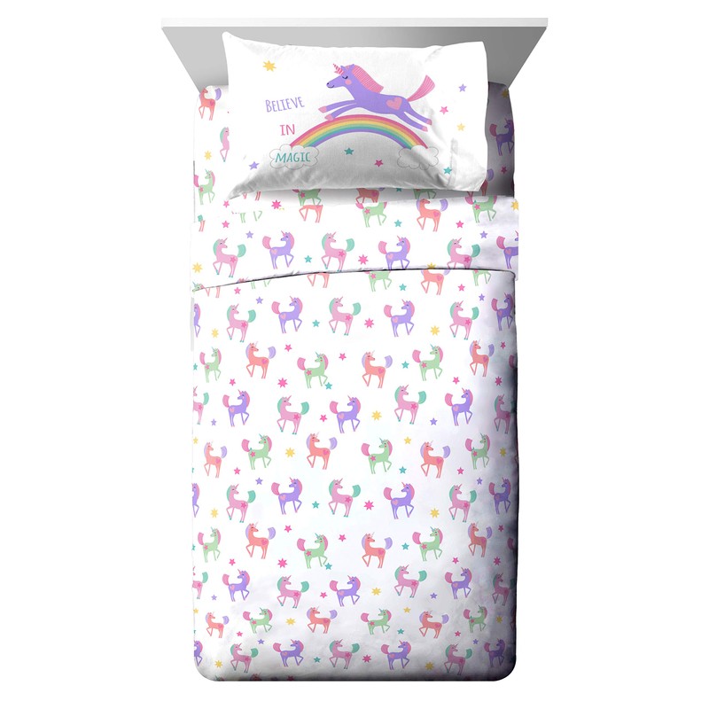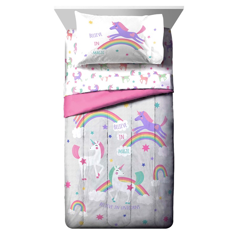 - GREAT GIFT - This Trend Collector twin bed set will make any child smile and will transform any bedroom, guest room, kids room, RV, or vacation home. Great gift for school or home. It rolls up for easy storage and travel. Fun and colorful design features cute magical unicorns.
