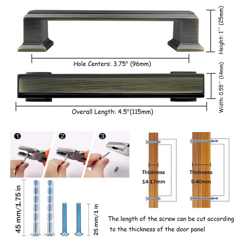 - Complete with fixing screws for easy installation. Simply use a drill with appropriate size to dill 2 holes on the door panel, then attach the cabinet handle and tighten the screws.