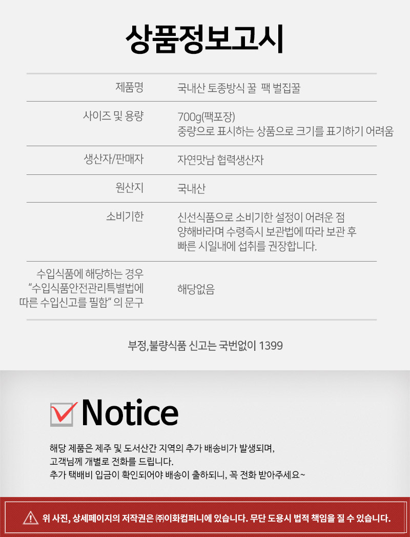 국내산 토종방식 꿀 팩 벌집꿀 700g (팩포장)