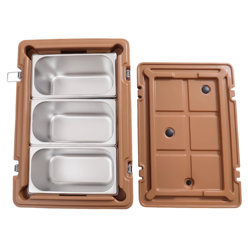 Would you like to have both good food and cold drinks while camping? Then this insulated food pan carrier box with a good thermostat effect for both hot and cold can meet your needs. It has three internal food pans with a capacity of 7.3Qt/1.85Gal, which can meet your family's dietary needs. And because of its environmentally friendly material, you can rest assured that the food will be served in it.