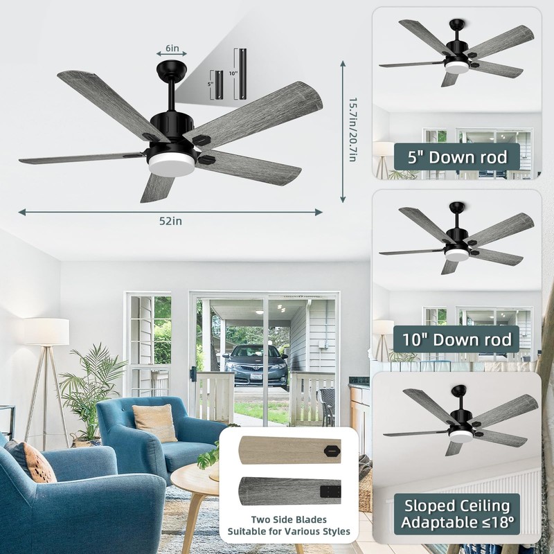 - 【Modern Style】: 52-Inch Modern Ceiling Fan uses the metal matte motor housing with white acrylic lampshade and five double-sided blades. While bringing you coolness and comfort, it also becomes a beautiful decorative piece for your home and (including 5 "/10" lower rod) can be installed on a 15 ° inclined ceiling. (Suitable for any indoor and covered outdoor Patio, farmhouse etc)