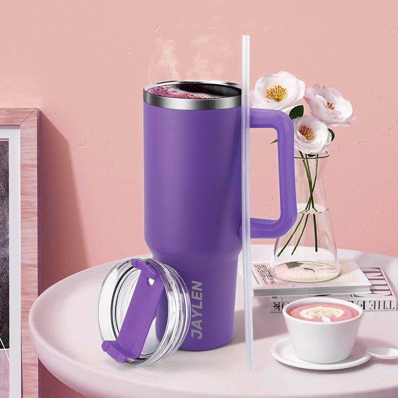 JAYLEN 40 oz con mango de acero inoxidable taza de café aislada de café con volumen de café de vacío de pared doble con paja para bebidas heladas y bebidas calientes (Morado oscuro)