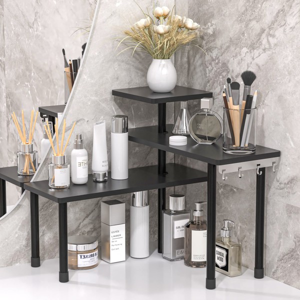 - MULTIFUNCTIONAL COUNTER ORGANIZER: The corner bathroom shelf organizer with black color be can perfect as makeup organizer shelf, vanity organizer, sink side counter shelf, bathroom shelf organizer, kitchen countertop organizer, plant display stand, desktop shelf which is a real hero that make your home well organized.