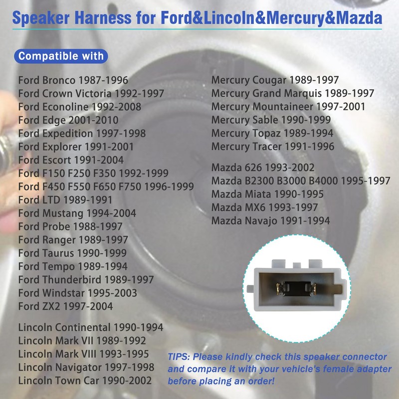 - Fit for Mercury Speaker Wire Adapter: Compatible with Cougar 1989-1997, Grand Marquis 1989-1997, Mountaineer 1997-2001, Sable 1990-1999, Topaz 1989-1994, Tracer 1991-1996