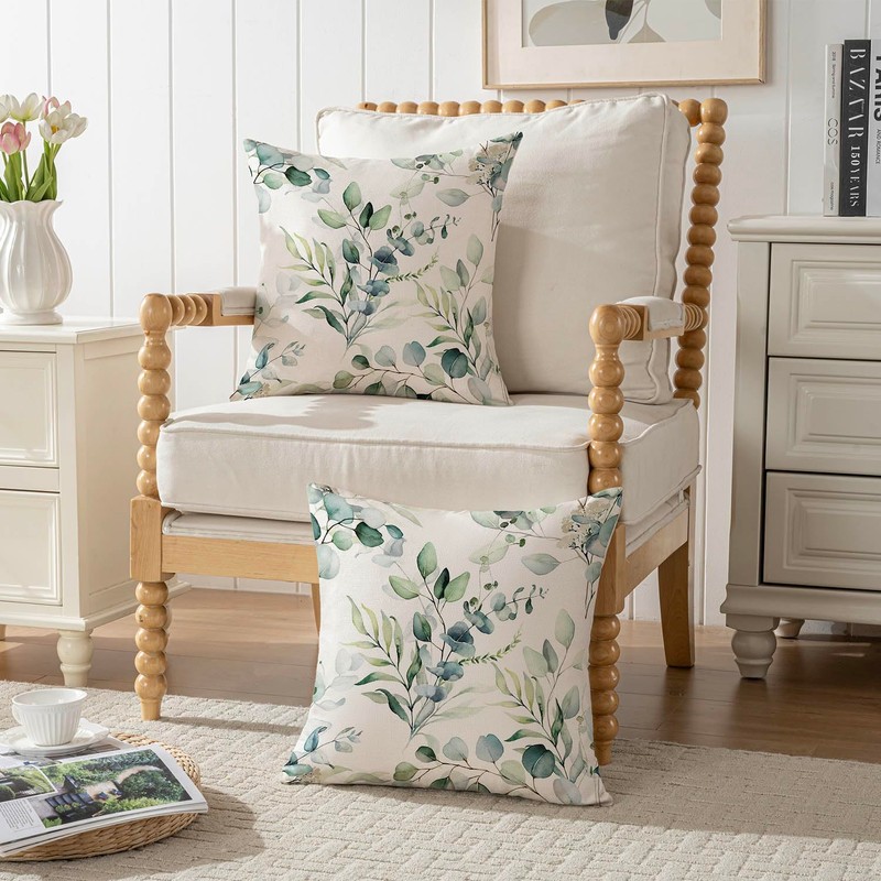 Jayusaror Spring Cushion Cover, 45 x 45 cm, Green Eucalyptus Watercolour Leaves, Outdoor Sofa Cushion Covers, Decorative Cushion, Couch Cushion Covers, Garden Sofa Decoration, Set of 2