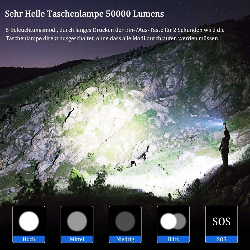 - EXTREM HELL TASCHENLAMPE: Diese LED Taschenlampe bietet eine hohe Lichtleistung von 50.000 Lumen. Wenn Sie die Taschenlampe nachts einschalten, ist es so, als würden Sie die Sonnenstrahlen in der Hand halten. Wenn Sie den Spot-Modus der Taschenlampe verwenden, kann sie im High-Intensity-Modus Straßenschilder in einer Entfernung von bis zu 1.800 Metern beleuchten, und wenn Sie den Flood-Modus der Taschenlampe verwenden, kann sie einen Bereich von bis zu 280 Quadratmetern um Sie herum beleuchten