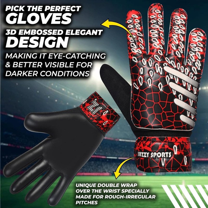 Jazzy Sports Soccer Goalkeeper Gloves for Kids Youth & Adult Funky Football Goalie Glove with Double Wrist Protection 4MM Latex Palm Goalie Gloves (Red, Size 4 Suitable for 6-9 Years)
