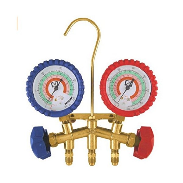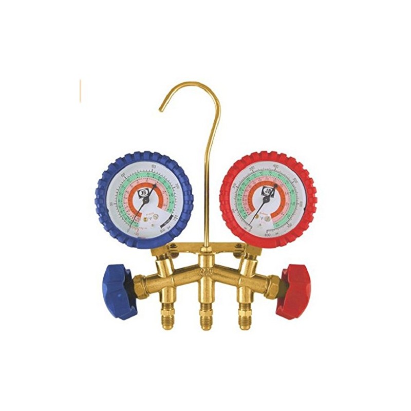 - Brass 2-valve manifold - Standard 2-1/2" gauges R-22, R-404A, R-410A