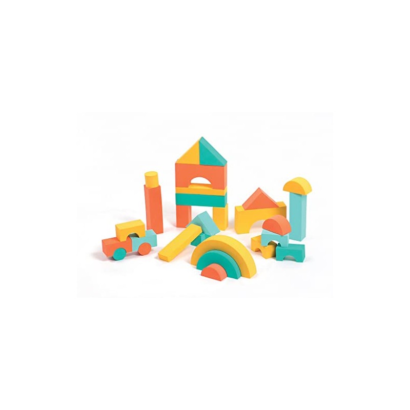 - 28 colourful foam elements that allow children to build their first buildings, perfect for discovering gentle stacking and interlocking