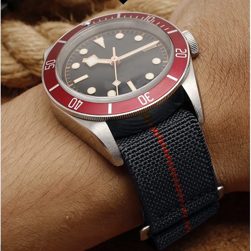 It's a high-density special rubber nylon belt, can withstand high tension and remain elastic. Military army style watch strap design.