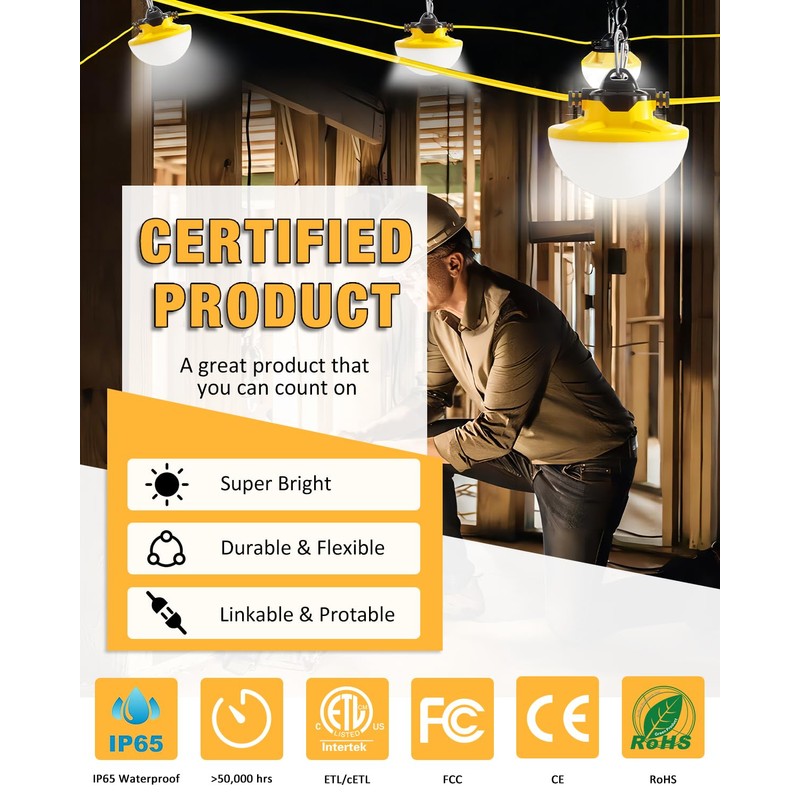 - 【Industrial Grade】Construction string lights using high lumen led and pc protective cover, more durable and drop resistant than traditional fixtures, reducing maintenance and repairs. The cables for the led string work lights are made of professional heavy duty 18AWG wire. Industrial grade double insulation. And with IP65 waterproof function