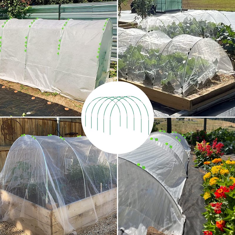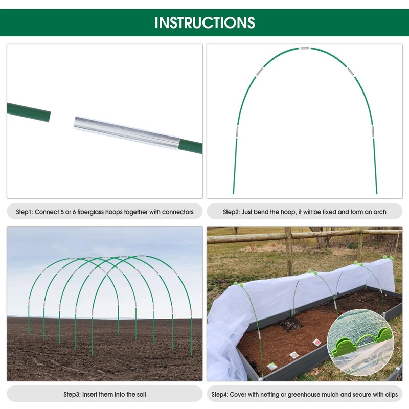- Easy to Assemble: No special tools required! Simply insert the garden hoops into the soil, connect a certain number of garden hoops with connectors according to your needs, simply bend the garden hoop, insert the other side into the soil and cover with garden netting or greenhouse netting secured with clips.