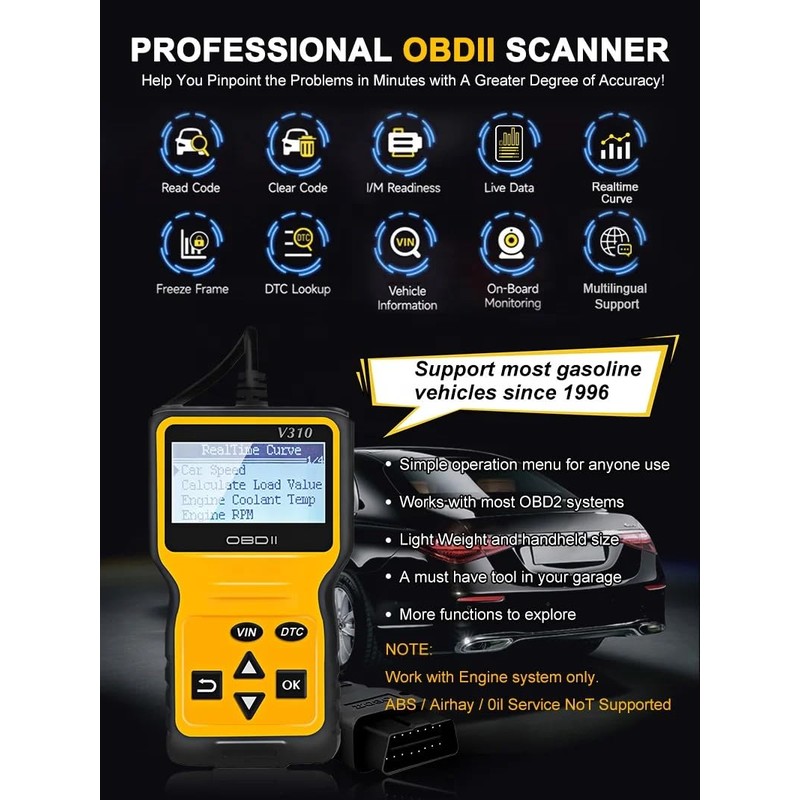- ⚠️ Engine System Only – This scanner reads and clears check engine light codes (OBDII system only). Does not support ABS, SRS (airbag), oil service lights, or other non-OBDII systems.