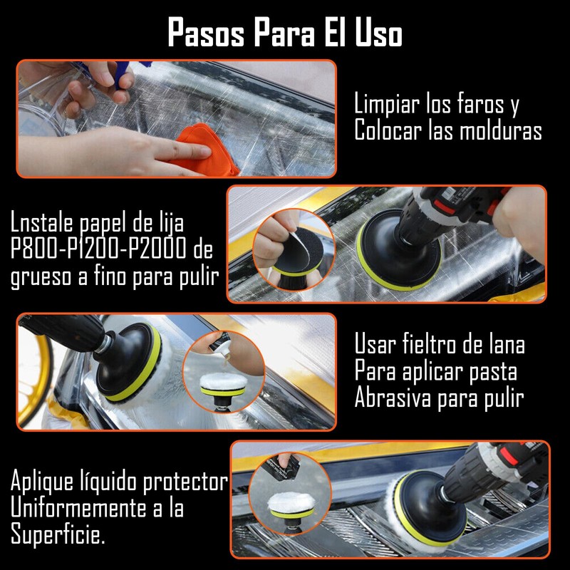 - 【Amplia Aplicación】: Nuestro restaurador de faros de auto es ideal para reparar faros, Luces traseras, Luces antiniebla, Intermitentes y lentes de faros. Repare, Mantenga y proteja rápida y fácilmente todo tipo de faros delanteros acrílicos y de plástico lisos y brillantes para obtener un acabado transparente utilizando un taladro doméstico común.